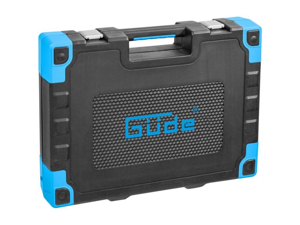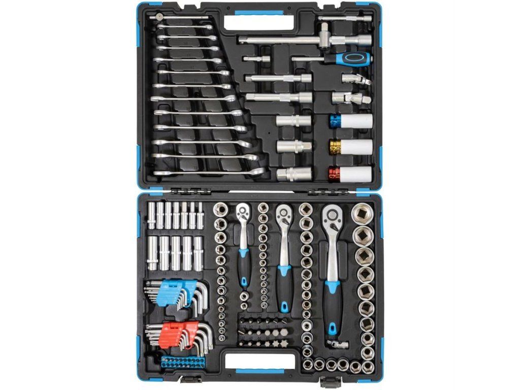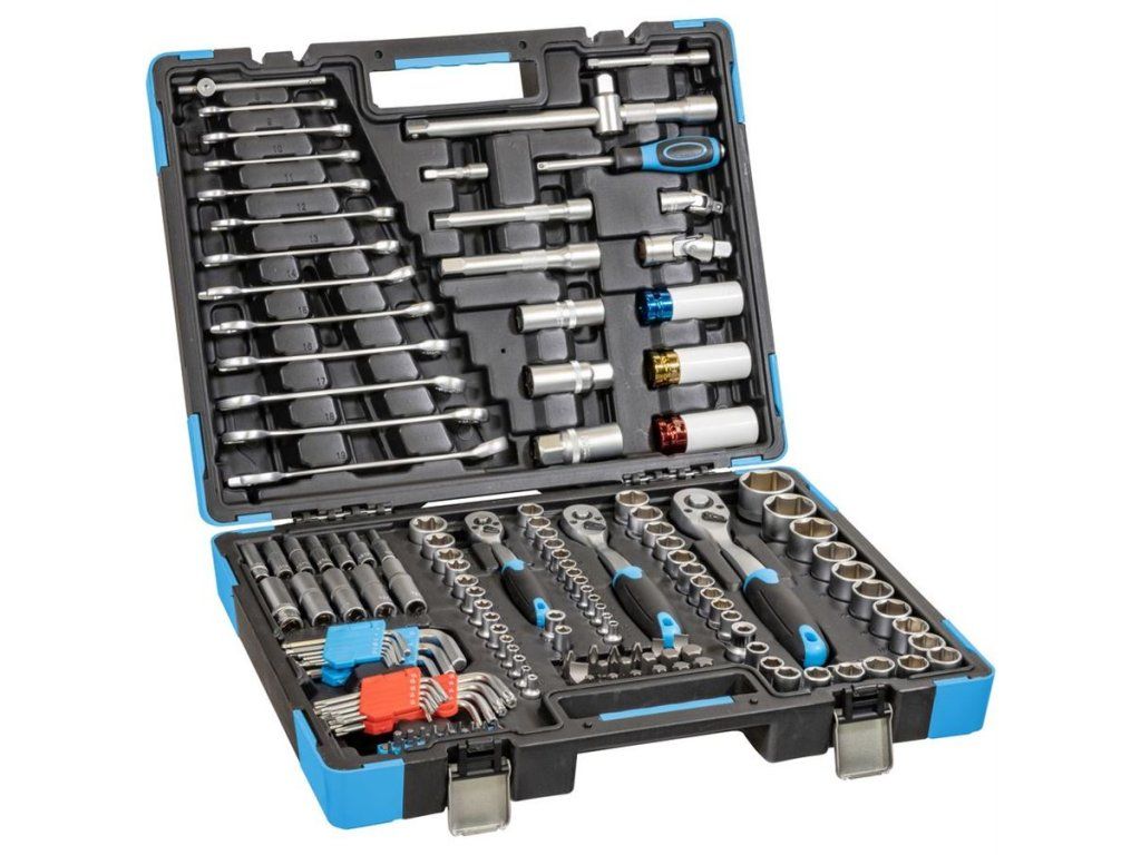 Sada nářadí obsahuje 3 ráčny (1/2", 3/8", 1/4"), prodloužení, kardanové klouby, očko-ploché klíče, imbusové klíče, nástrčkové klíče, posuvné T-rukojeti, bitové adaptéry, šroubovák s ráčnovou funkcí, soupravy bitů, nástrčkové klíče na rázový utahovák.