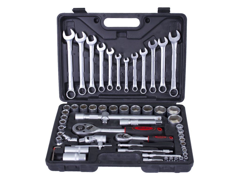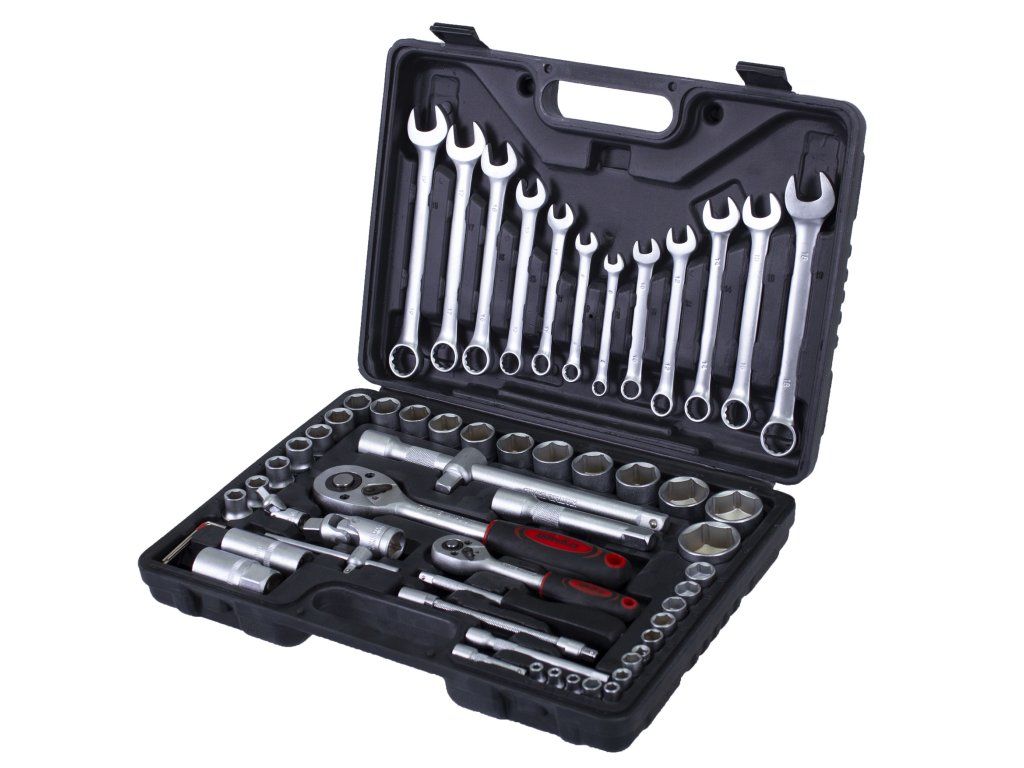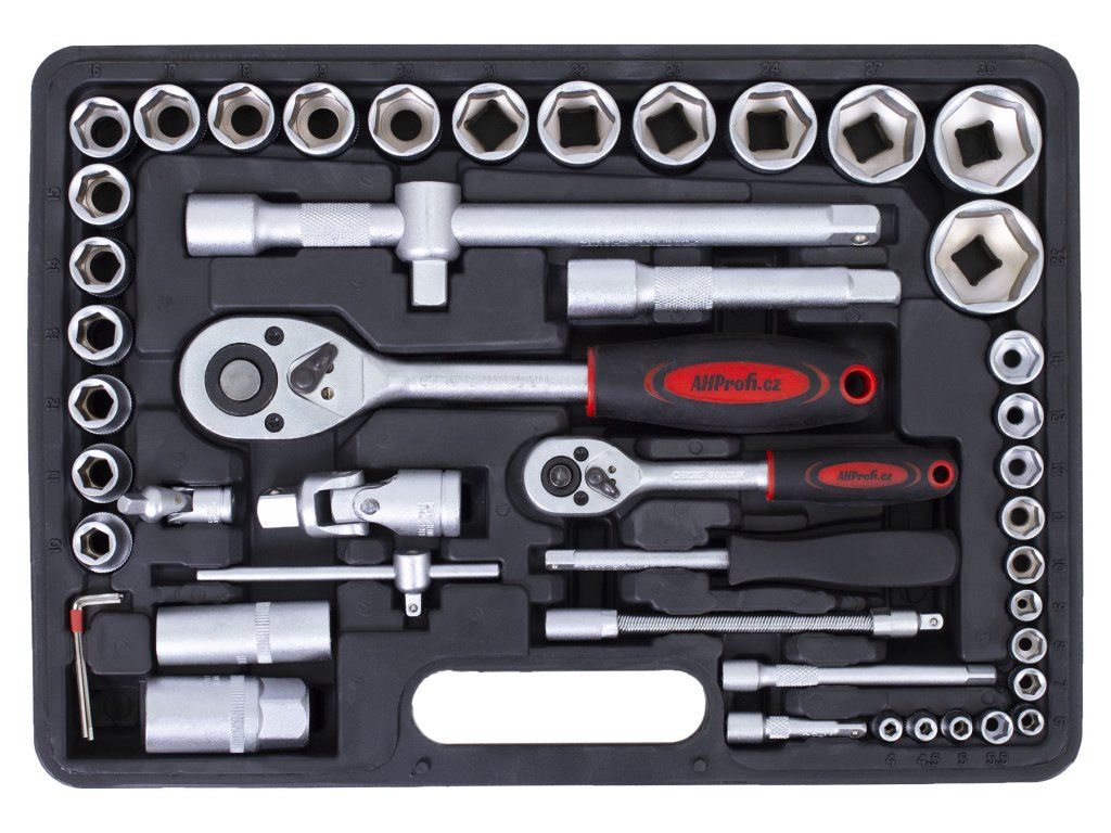 Gola sada složená ze 61 dílů. Sada obsahuje 2 ráčny, ořechy, očkoploché klíče a další díly s nejpoužívanějšími rozměry 1/2" a 1/4". Nářadí je vyrobeno z Cr-V a je uloženo v plastovém kurfu. Celou sadu tak můžete snadno přenést.