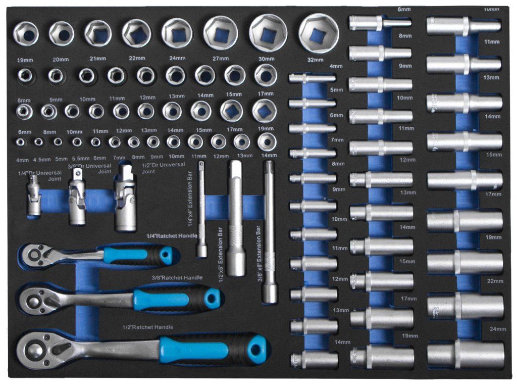 Gola sada s 1/2", 3/8" a 1/4" ráčnami a 77 nástavci.