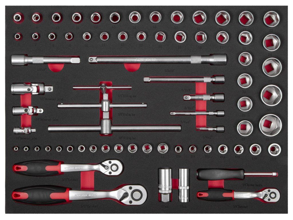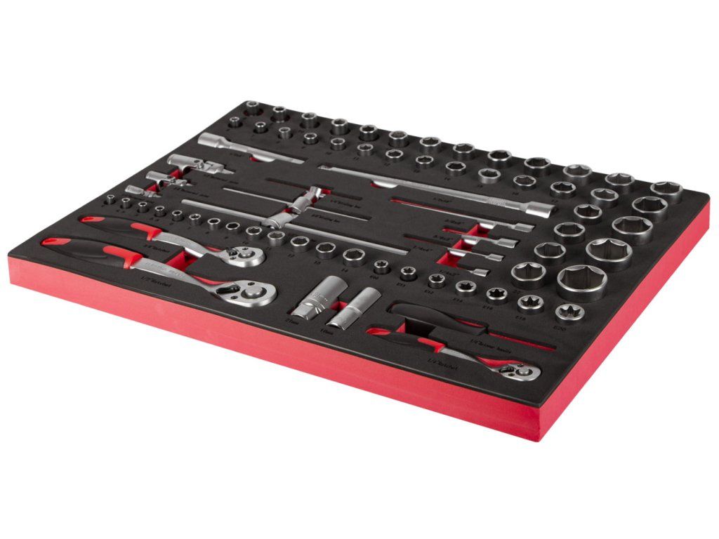 Výplň do dílenského vozíku s nářadím, gola sada 1/2", 3/8" a 1/4", rozměry výplně 525 x 390 x 36 mm. Nástrčné klíče, prodlužovací nástavce, kardanové klouby, aj.
