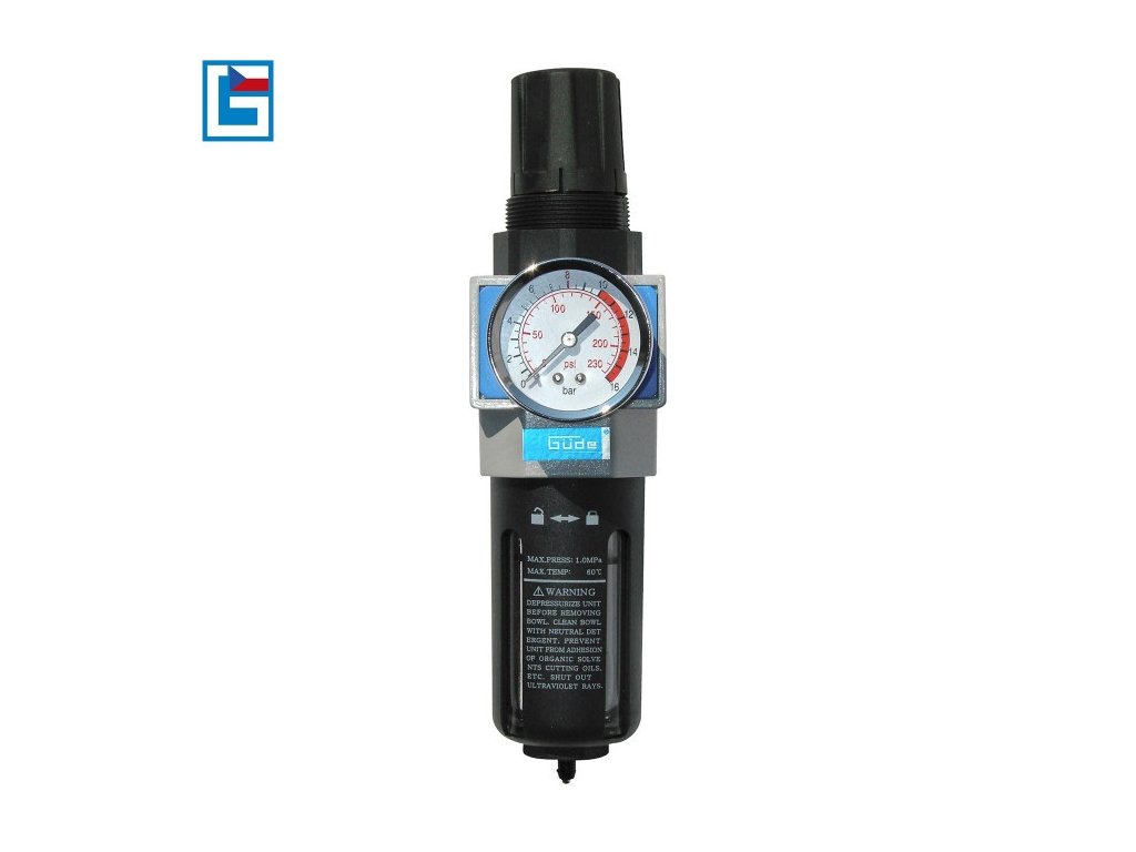 - Vybaveno manometrem, otočnou hlavicí pro aretaci tlaku vzduchu, filtrační vložkou, průhledná zachycovací nádobkou kapalin a výpustný ventil s možností manuálního odpouštění kondenzátu.