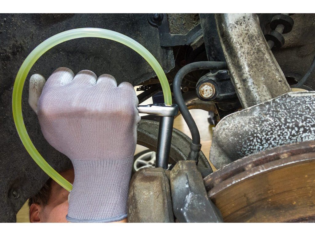 Transparentní silikonová hadice na vedení bzdové kapaliny při ovdušnovaní brzd.