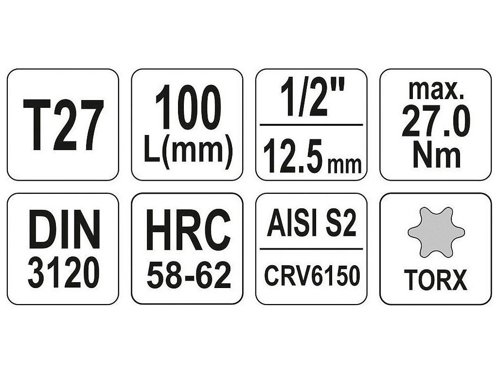 Dlouhé provedení. Velikost T27. Rozměr čtyřhranu 1/2".
