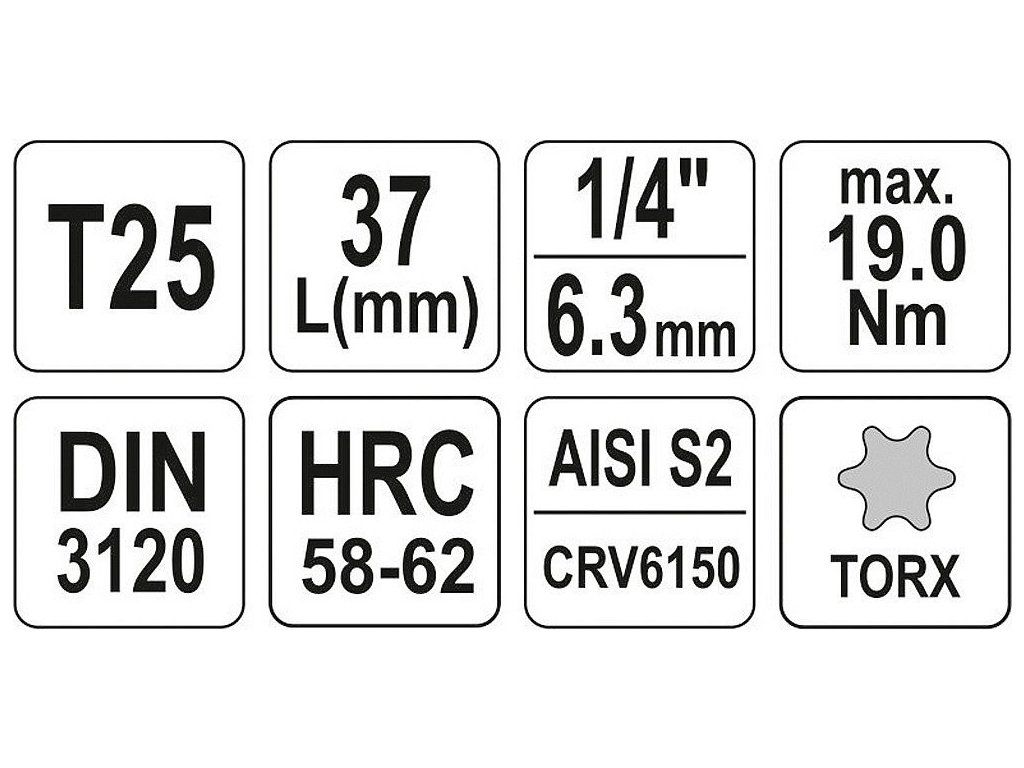 Krátké provedení. Velikost T25. Rozměr čtyřhranu 1/4".