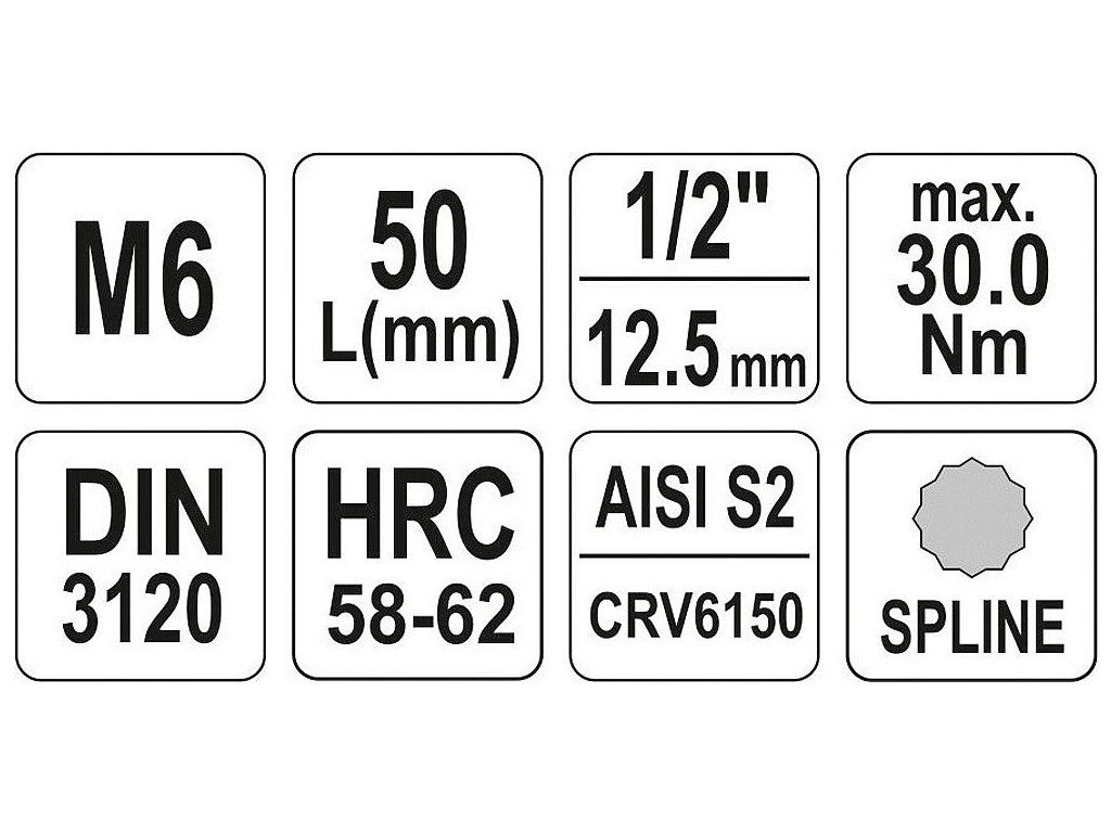 Délka 50 mm. Velikost M6. Rozměr čtyřhranu 1/2".