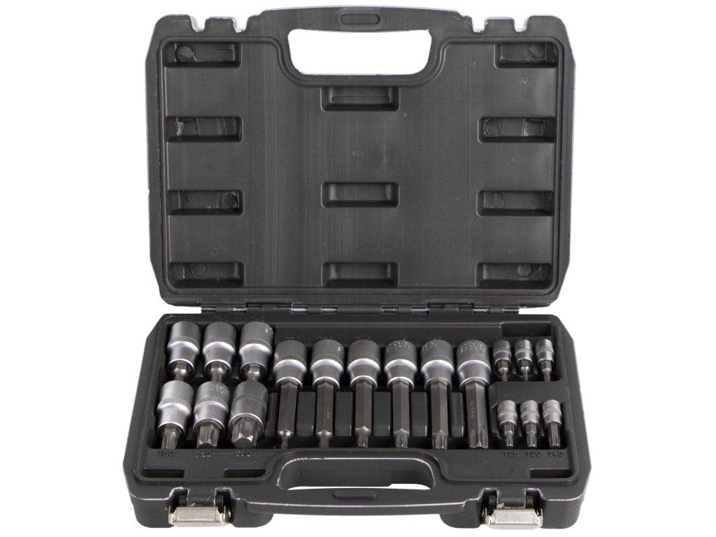 Hlavice s bity TORX pro 1/2" a 1/4" ráčny v praktickém plastovém boxu, který se použije jak na cesty nebo pro šikovné uskladnění do regálu či dílenského vozíku.
