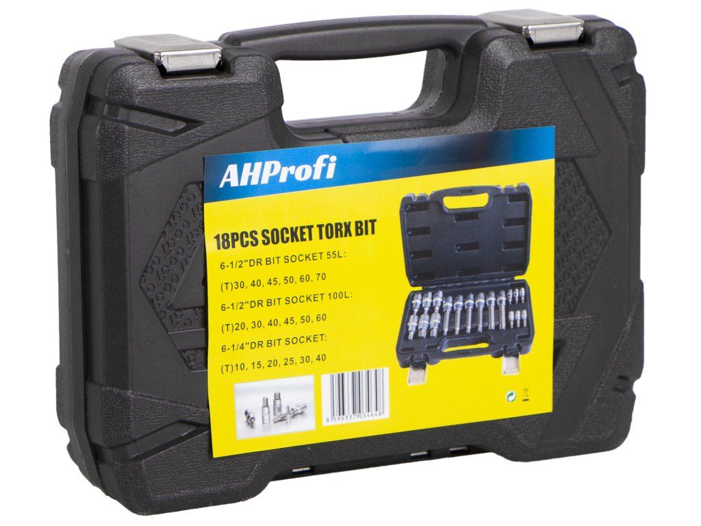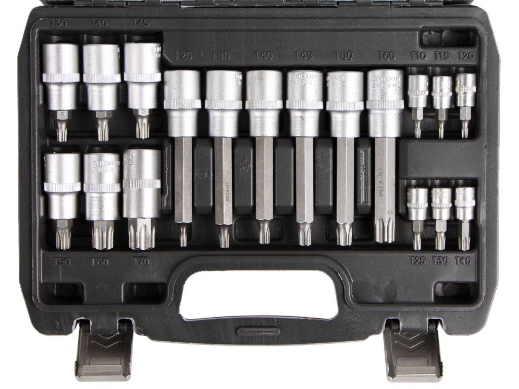 - 6 ks 1/2" bity (100mm): T20, T30, T40, T45, T50, T60.