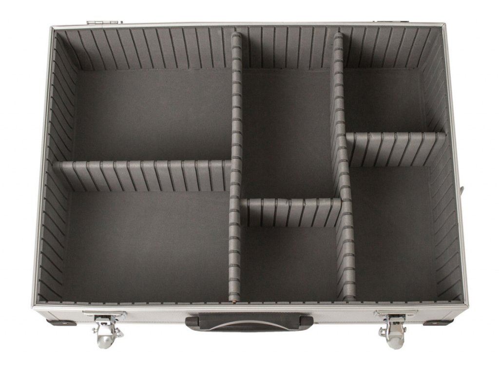 Lehce přenosný kufr na nářadí díky madlu a popruhu na ramena. Skladovací prostor obsahuje přemístitelné přepážky a vyjímatelnou desku s kapsami. 460x330x150 mm.