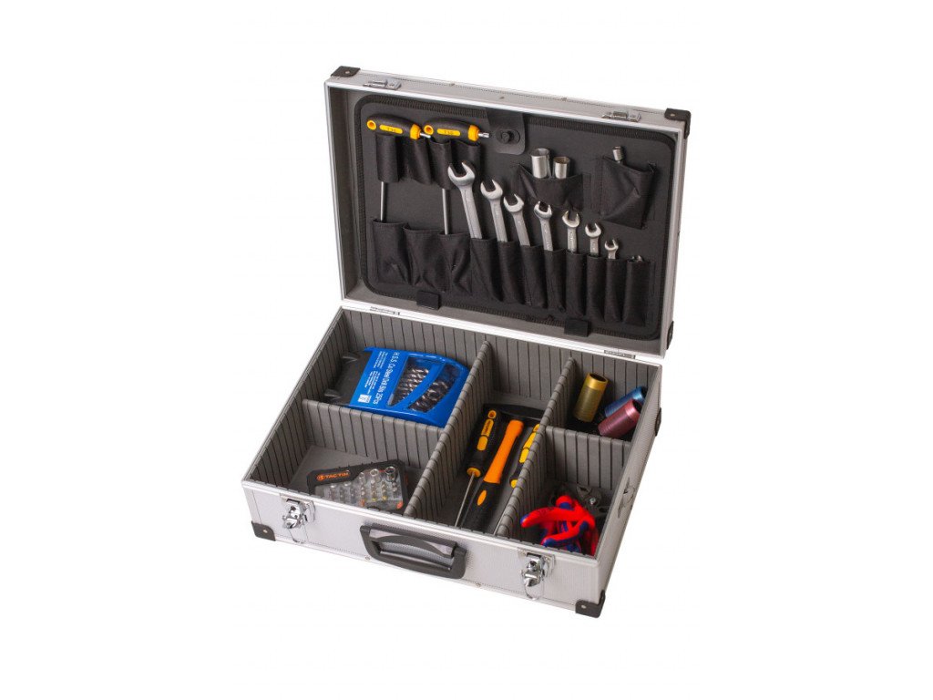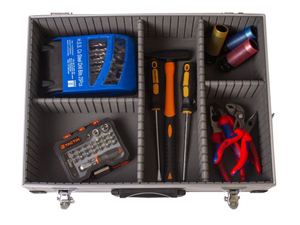 Hliníkový kufr na nářadí o rozměrech (š x h x v): 460 x 330 x 150 mm. Kufr je lehce přenosný díky madlu, nebo přídavnému popruhu na ramena.