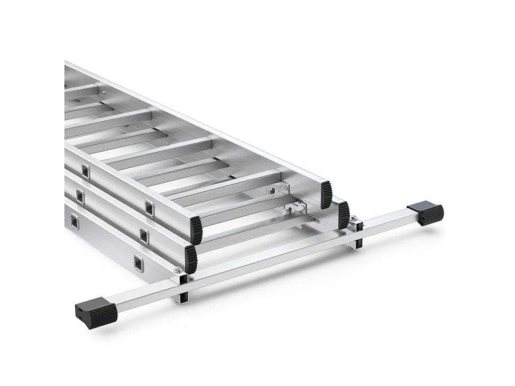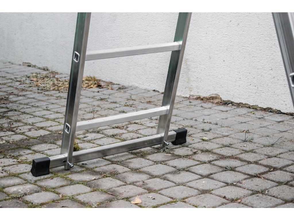Stabilizační lišta o délce 675 mm s protiskluzovými zakončeními zajišťuje, že se žebřík nehýbe ani na nerovném povrchu.