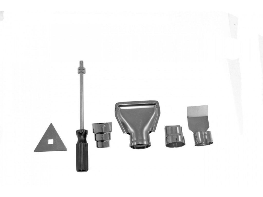 Příslušenství: sada trysek (→ 4, plochá/nahřívací/redukovaná/reflektorová), ocelová škrabka pro odstraňování barev/tmelu,