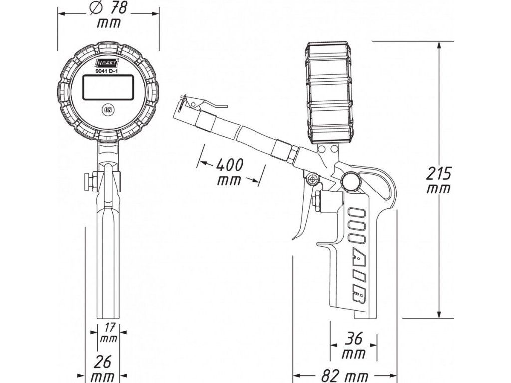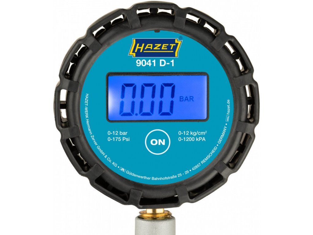 Hustič pneu s digitálním manometrem od německého výrobce HAZET s digitálním displejem a délkou hadice 400 mm zakončenou rychlospojkou 1/4" pro snadné připojení ke kompresoru.