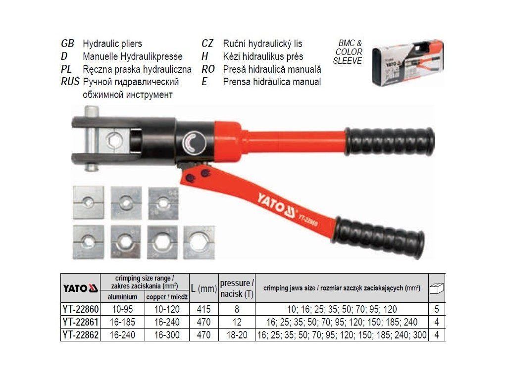 Lisovací kleště na koncovky kabelů s hydraulickým posilovačem s maximálním tlakem 8 tun. Ke kleštím jsou v balení lisovací koncovky pro měděné vodiče o rozměrech 10 - 120 mm2 a pro hliníkové dráty s rozměry 10 - 95 mm2. Síla tlaku čelistí je regulovatelná a díky převodu hydraulické síly je lisování koncovek velmi jednoduché. Kleště s koncovkami jsou v plastovém boxu. Hydraulické lisovací kleště váží 2,8 kg a jsou 415 mm dlouhé.