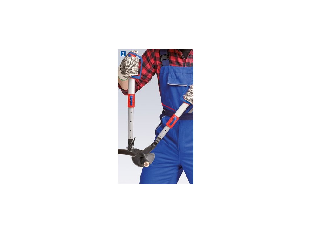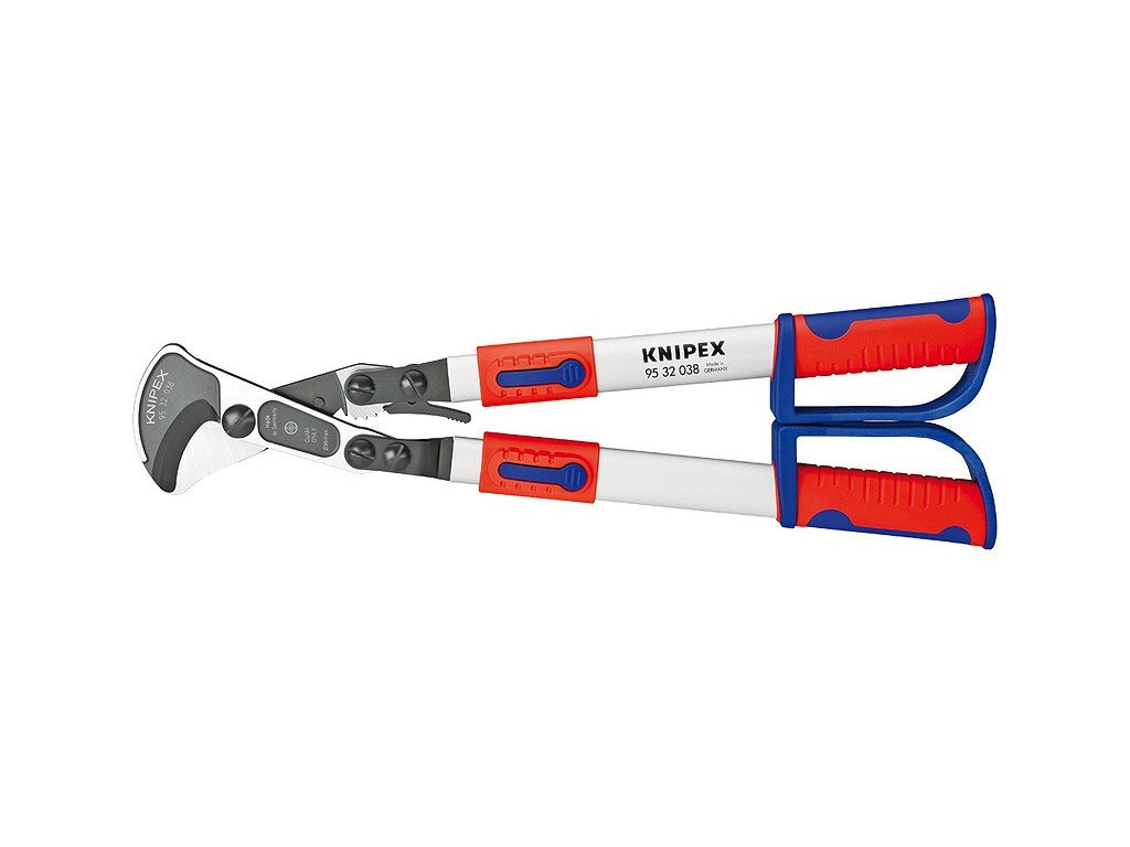 Kabelové nůžky s nastavitelnými a výkyvnými výsuvnými rameny. Pro průměr kabelů do 38 mm, výkyvné rukojeti pro nastavení optimálního rozestupu ramen, zvláště vhodné pro práci v zúžených prostorech. Pohodlná práce díky principu rohatky se západkou a nízké hmotnosti.
