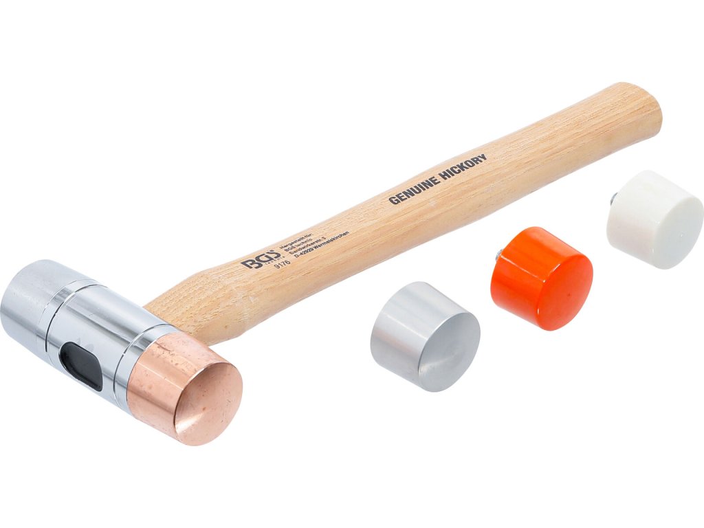 Hmotnost 892 g, délka 305 mm, vyměnitelné hlavy: měď, hliník, plast, nylon, ocel.