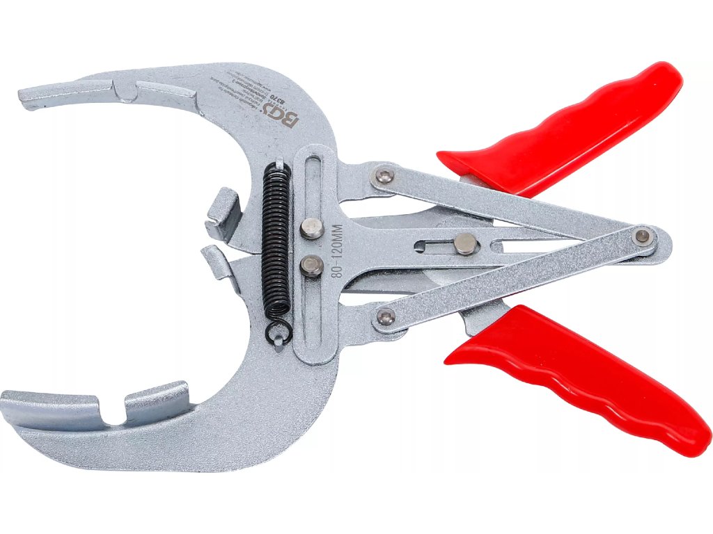 Kleště na pístní kroužky s průměrem 80 - 120 mm, ocelová konstrukce, protiskluzové rukojeti, přímý pákový mechanismus.