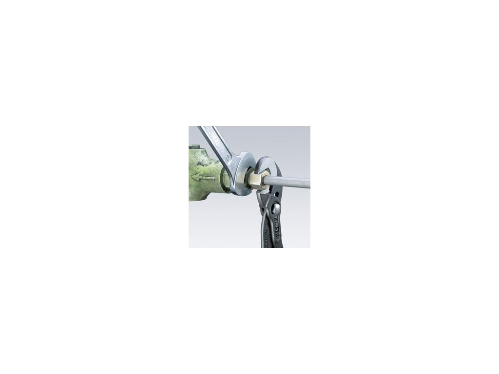 Pro metrické a palcové matice a šrouby velikosti 10 až 32 mm (3/8" až 1 1/4")- samosvorné v rozmezí od 17 mm: nehrozí klouzání po obrobku. Uchopení metrických nebo palcových šroubů se šestihrannou hlavou bez vůle, žádné zaoblení hlav šroubů. Bezpečné a pevné uchopení i zaoblených, zrezivělých nebo natřených matic a šroubů. Ideální pro práce na brzdové soustavě automobilů. Rychlé utažení a povolení šroubových spojů na principu rohatky se západkou. Nastavení stiskem tlačítka přímo na obrobku- možnost ručního nastavení. Jemné nastavení pro optimální přizpůsobení různým velikostem obrobků a ergonomickou polohu rukojetí. Posuvný průchozí čep kloubu: vysoká stabilita díky dvojitému vedení. Spolehlivé zaskočení čepu kloubu: žádné neúmyslné přenastavení. Příznivé působení pák: optimální přenos sil. Kryt chránící prsty uživatele před skřípnutím. Nahrazuje sadu klíčů, ideální pro kontrování. Chromvanadová elektroocel, kovaná, kalená v oleji.