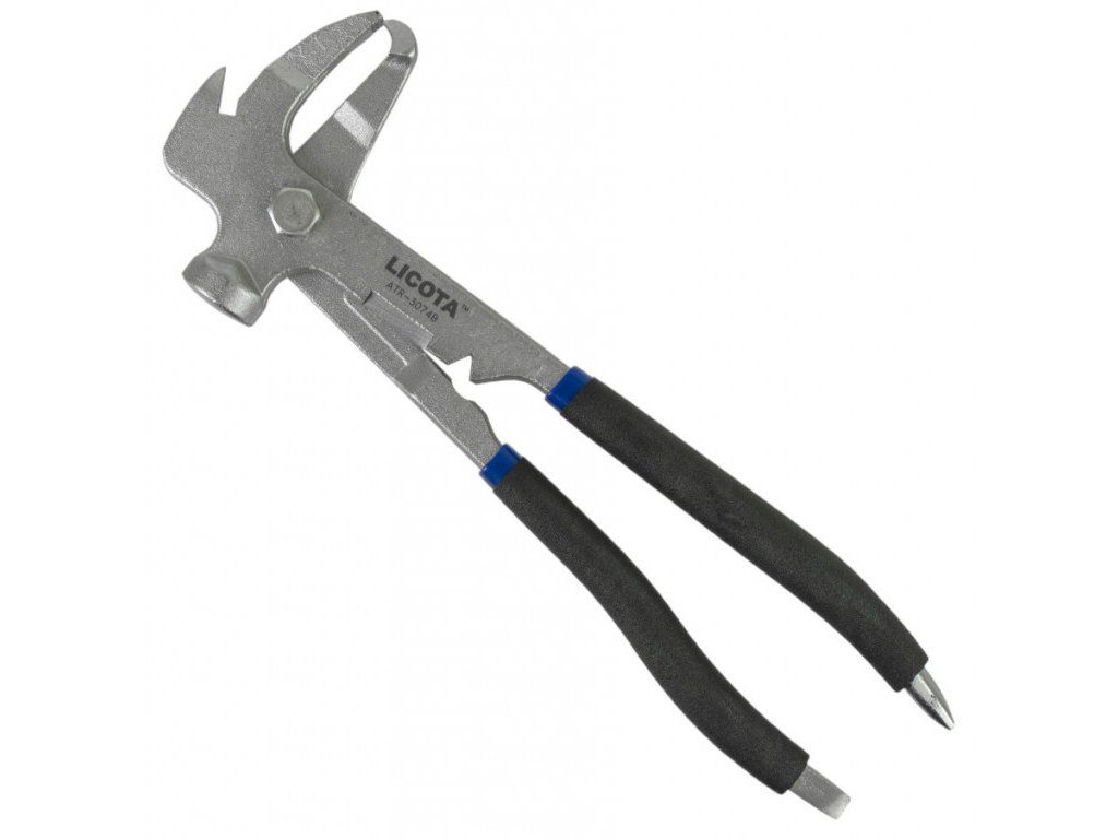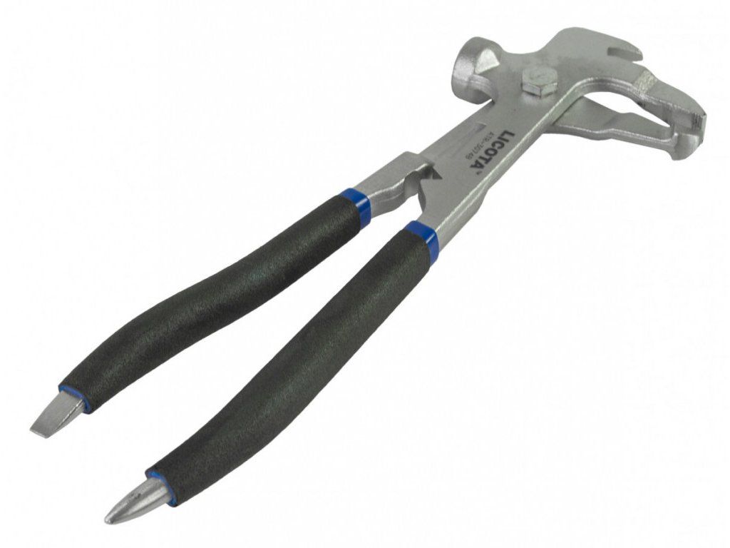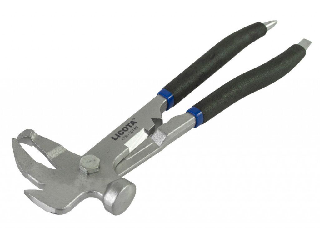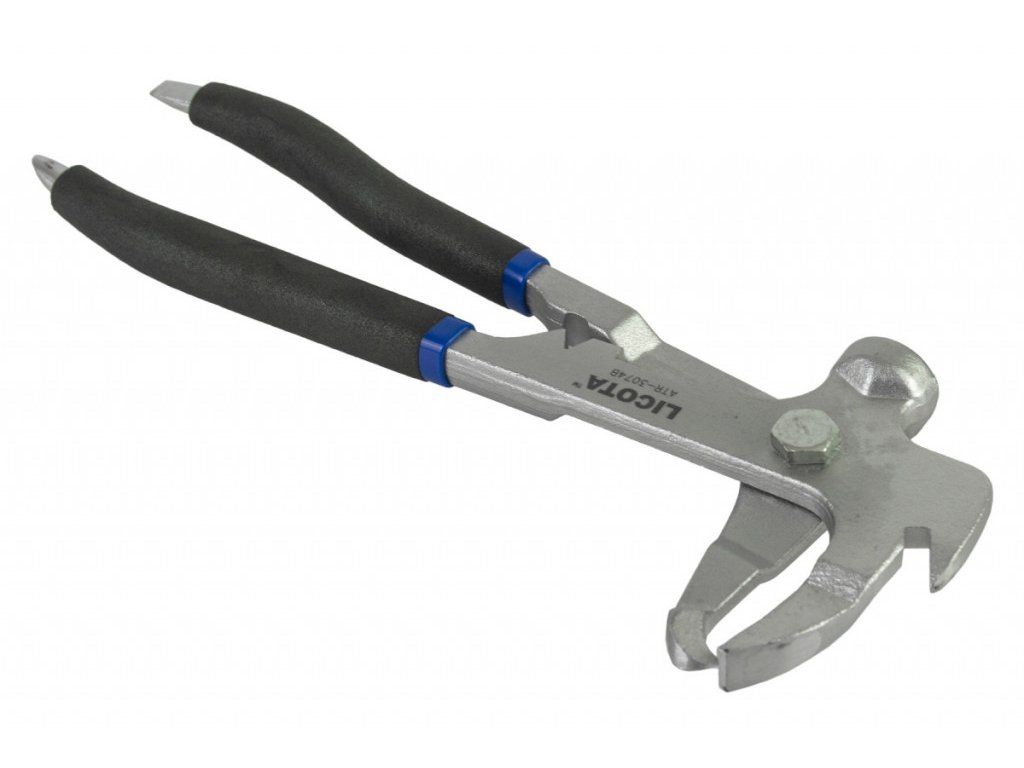 Kleště s čelistmi na sundavání a naklepávání vyvažovacích závaží kol automobilu.