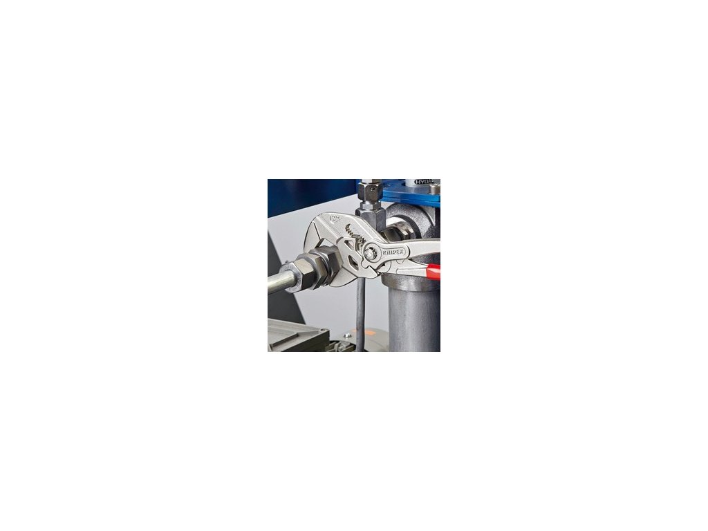 Nahrazuje sadu klíčů na šrouby, metrické i palcové. Hladké čelisti pro šetrnou montáž povrchově zušlechtěných armatur - práce přímo na chromu.