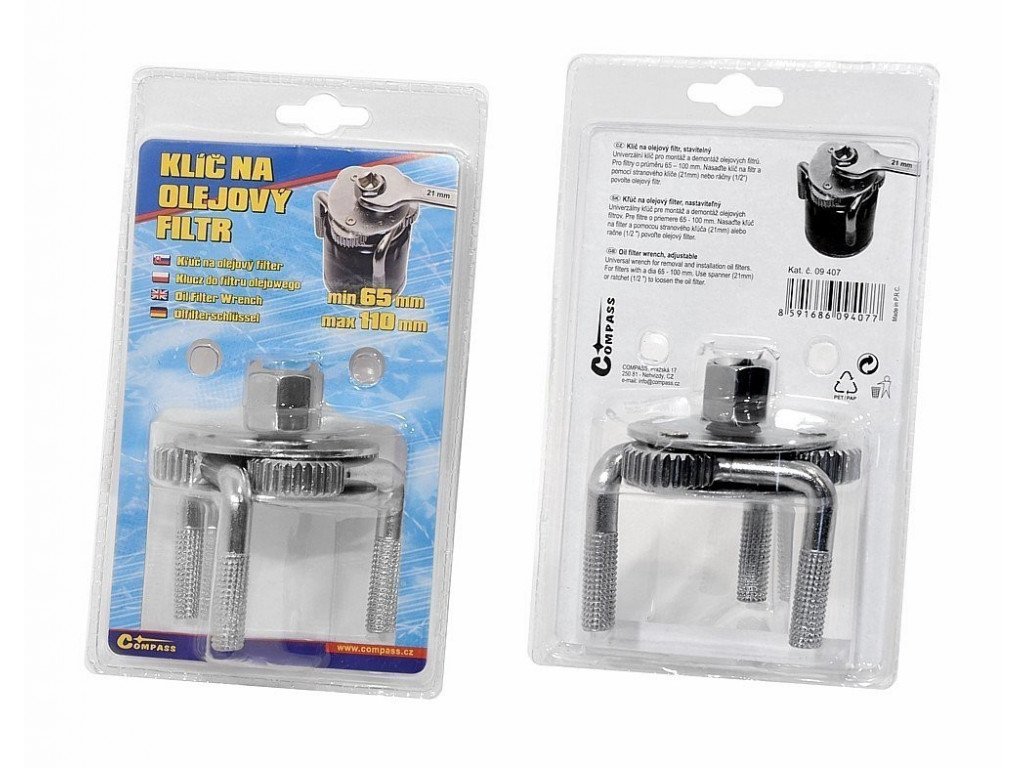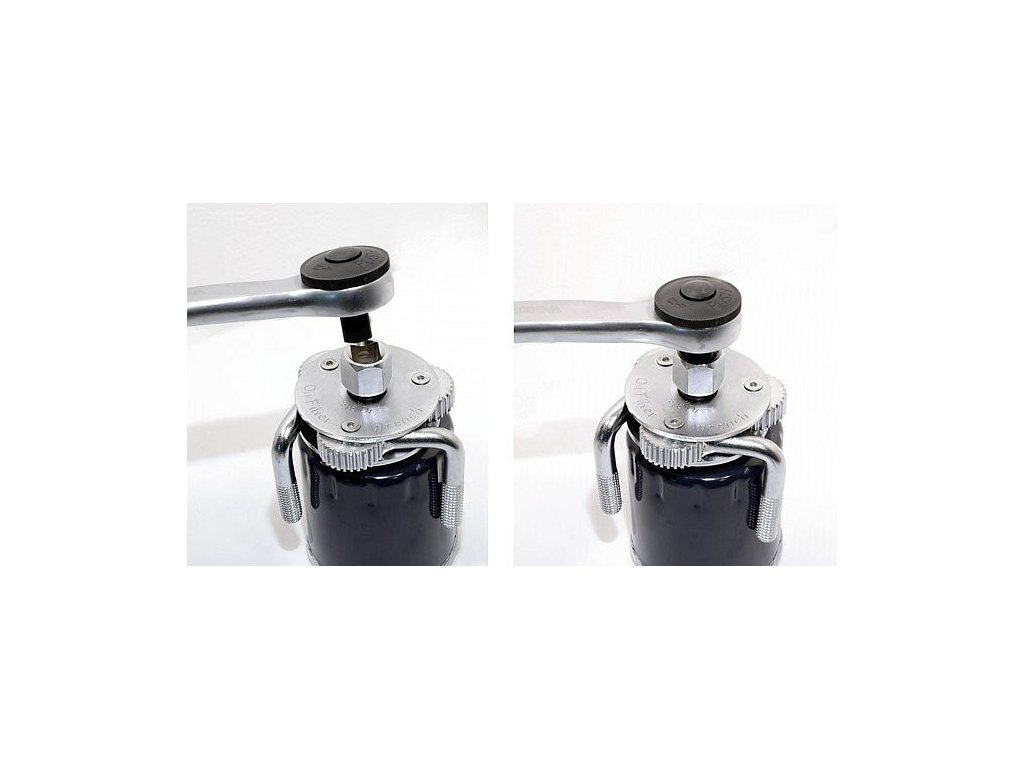 Univerzální klíč pro montáž a demontáž olejových filtrů. Pro filtry o průměru 65 - 125 mm. Vhodný i pro auta se zúženou pracovní oblastí. Celokovová konstrukce, povrchová úprava, zdrsnění (zuby) na upínacích ramenech pro pevný záběr při uvolňování nebo utahování olejového filtru. Klíč se nasadí na olejový filtr a pomocí ráčny (1/2") nebo stranového či nástrčného klíče (21mm) se olejový filtr utáhne či povolí.