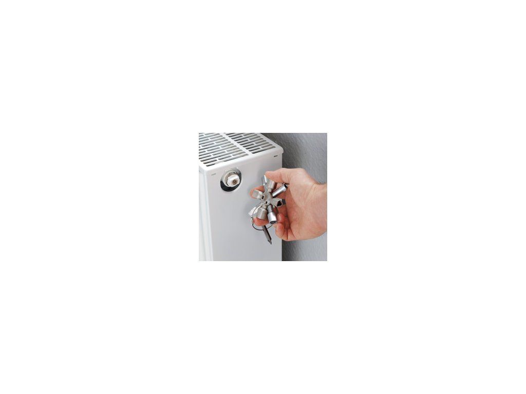 10 profilů. 2 kříže. 1 klíč.. Všechny běžné uzavírací systémy.. Multifunkční klíč pro ovládání uzávěrů z oblasti techniky budov (topení a sanitární zařízení, klimatizační a větrací technika, elektrotechnika), zásobování plynem a vodou a uzavíracích systémů. 8-paprsková verze: 2 křížové klíče spojené za účelem úspory místa pomocí magnetů. Otočný bit: drážka 1 x 7 mm a křížová drážka PH2. Klíč a otočný bit spojeny stabilním drátěným lanem z ušlechtilé oceli. Kvalitní povrchová úprava. Váhově optimalizovaná konstrukce ze zinkového tlakového odlitku.