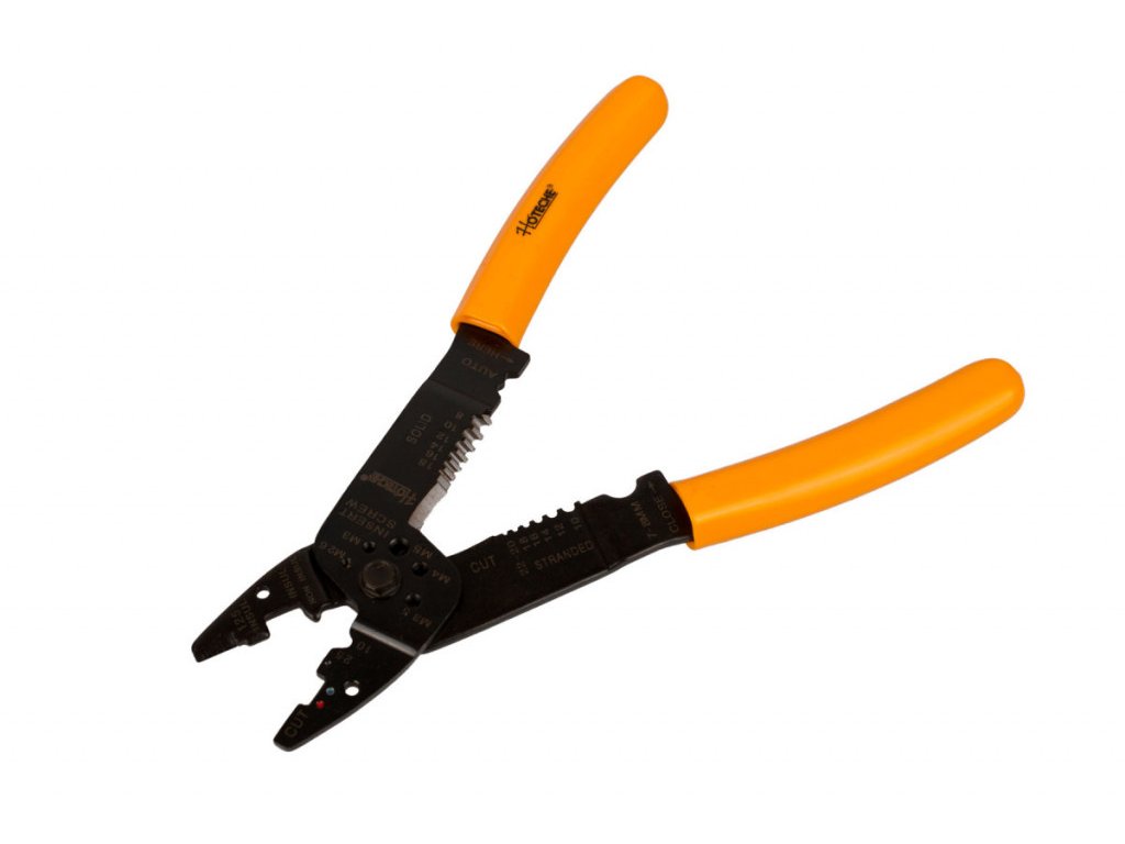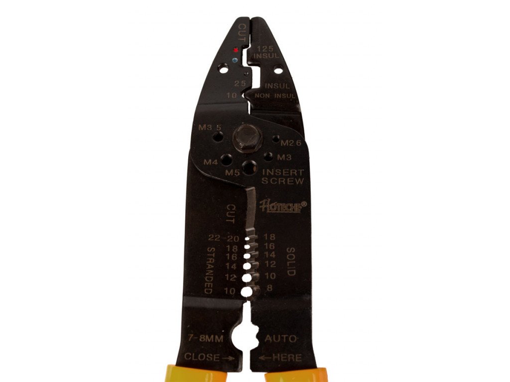 Konektorové kleště o délce 215 mm značky Hoteche využijete k odizolování drátů, stříhání kabelů, lisování izolovaných a neizolovaných kabelových ok a konektorů a otevřených konektorů.