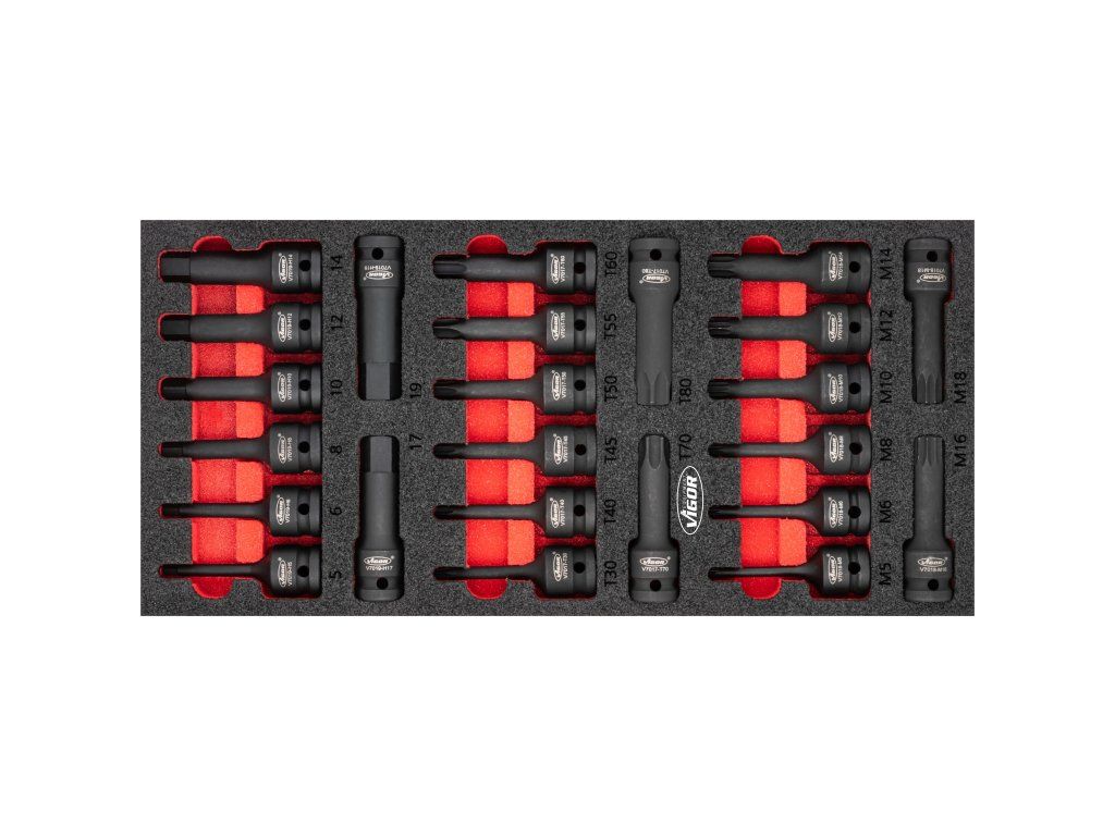 Pěnová vložka o rozměrech (š x h x v) 188 x 393 x 35 mm obsahuje celkem 24 ks profesionálních nástrčných klíčů Imbus, Torx, XZN, 1/2".