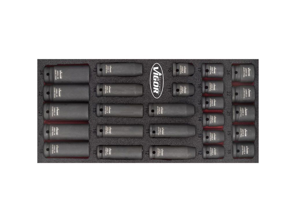 Pěnová vložka o rozměrech (š x h x v) 188 x 393 x 35 mm obsahuje celkem 26 ks profesionálních kovaných nástrčných klíčů 1/2".