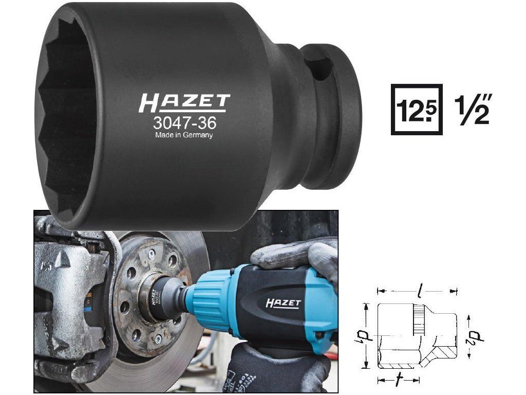 - Pevnostní dvanáctihranná nástrčná hlavice 1/2", vnitřní rozměr 36 mm.
