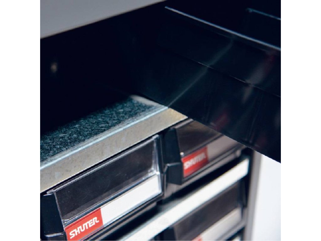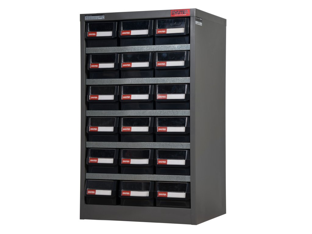 Kovový pořadač montážního materiálu a nářadí s celkem 18 zásuvkami z tvrzeného plastu, každá o rozměrech (Š x V x H) 164 x 105 x 375 mm.