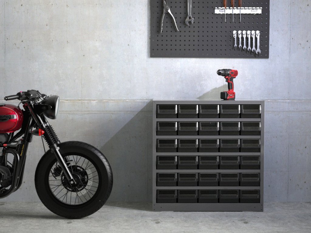 - Dílenský kovový organizér pro uložení montážního materiálu a nářadí s 30 zásuvkami.