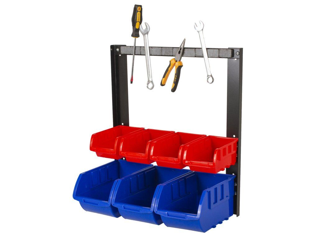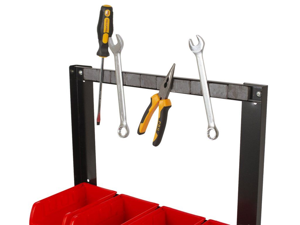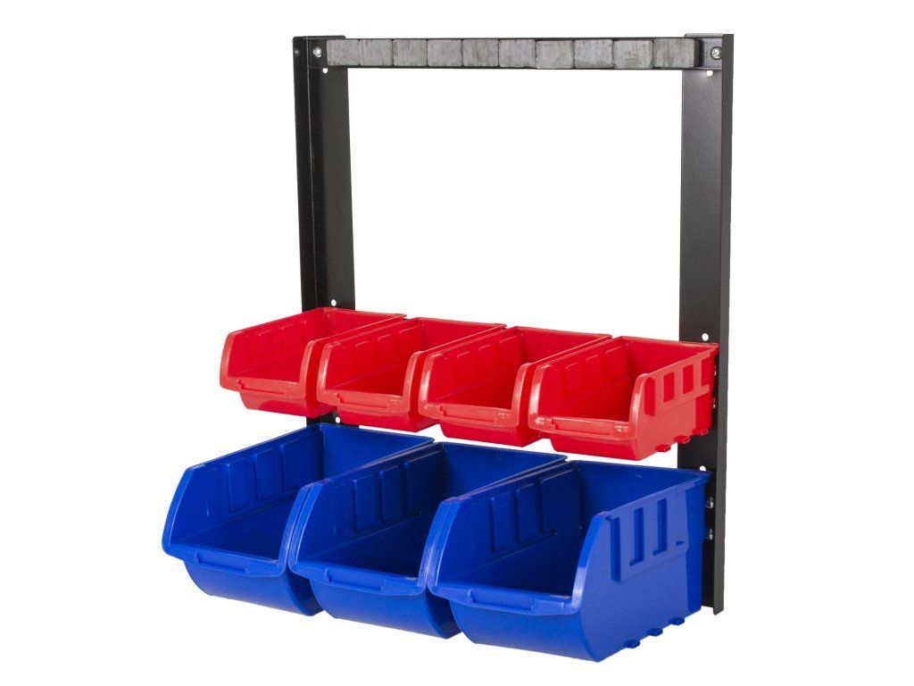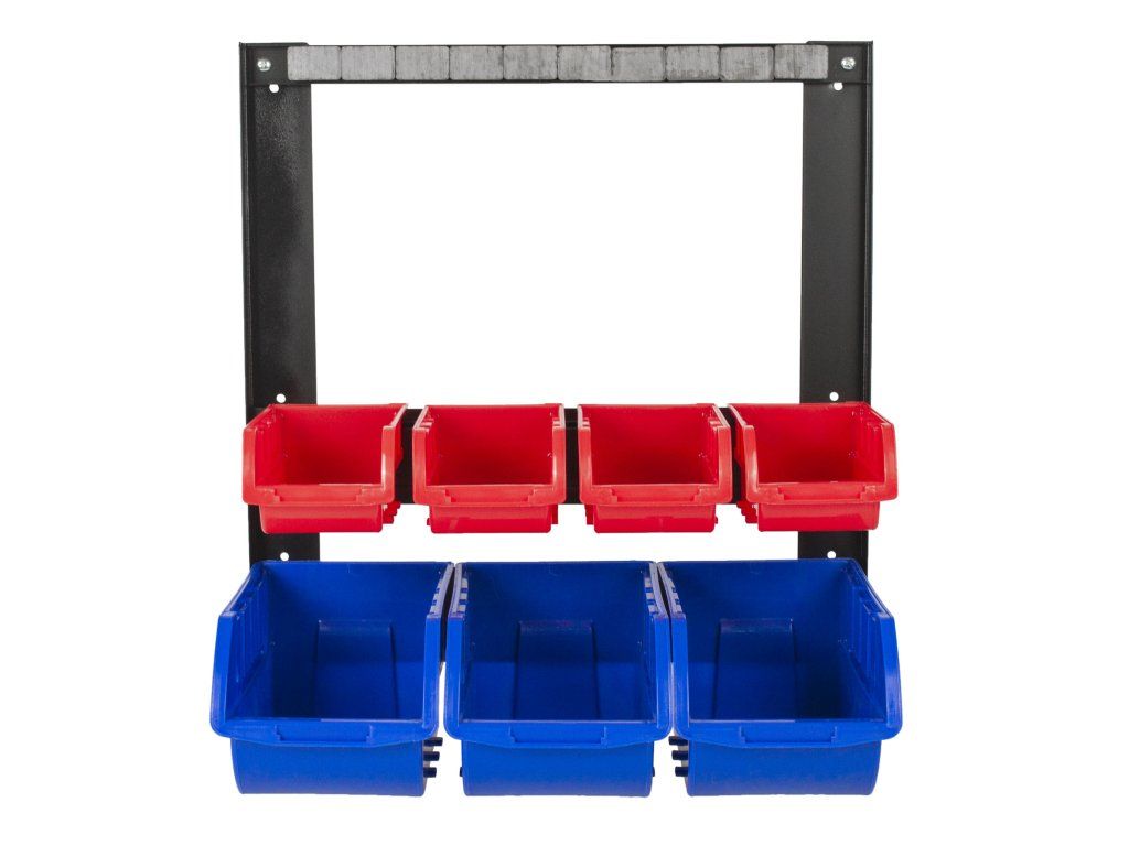 - Kovový rám organizéru na šroubky s 7 plastovými boxy na spojovací materiál a magnetickou lištou na nářadí pro dokonalou organizaci v dílně.
