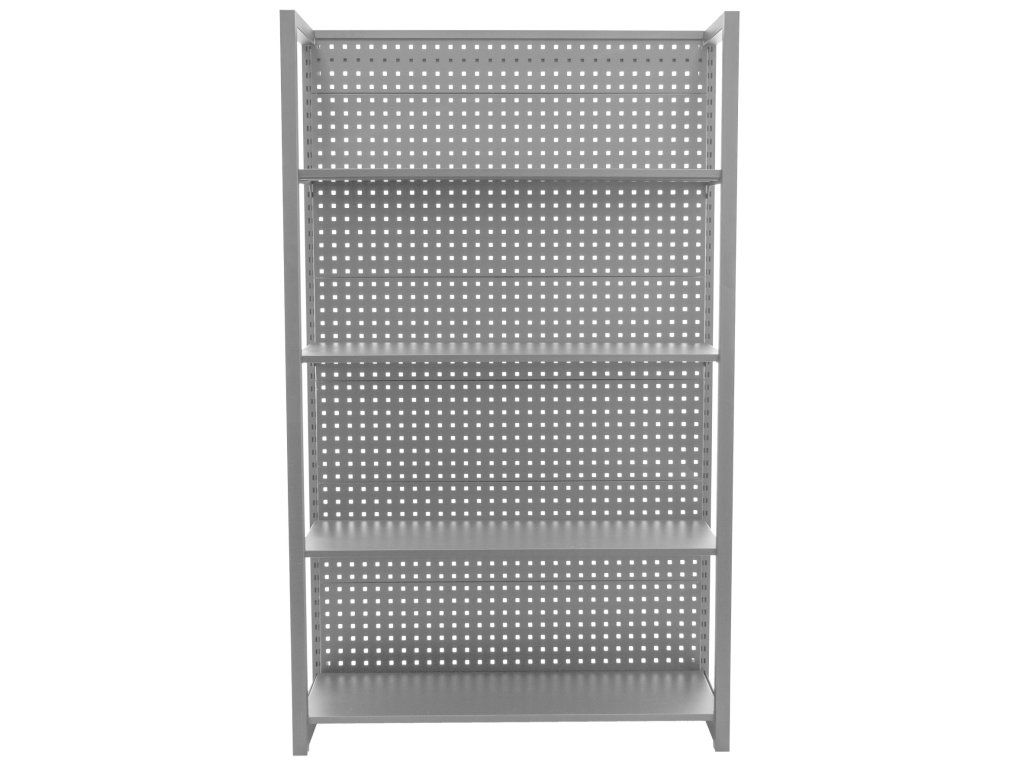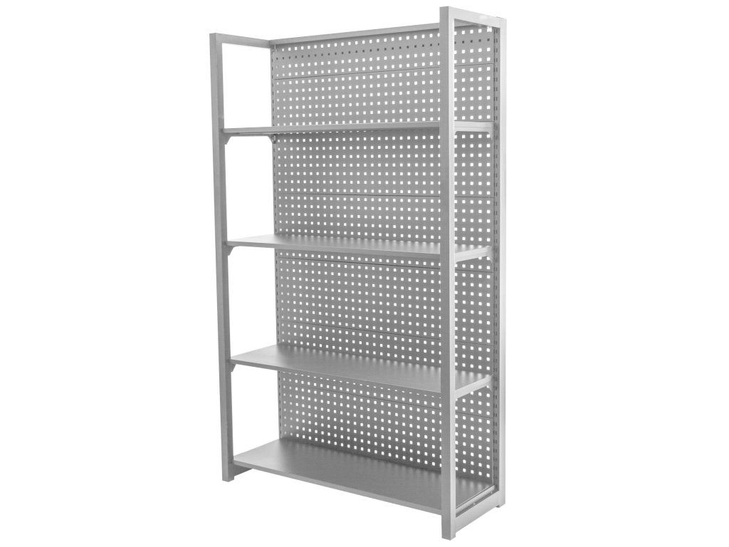 Policový regál se zadní děrovanou deskou, 4 police, rozměry 1200 x 458 x 2000 mm.