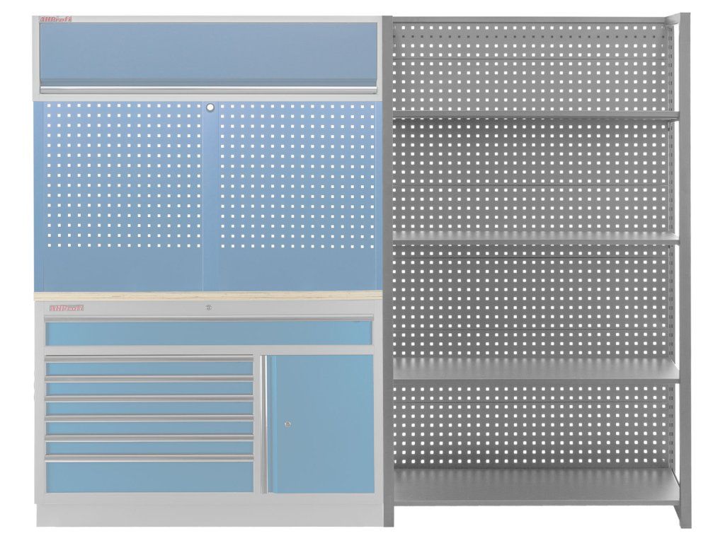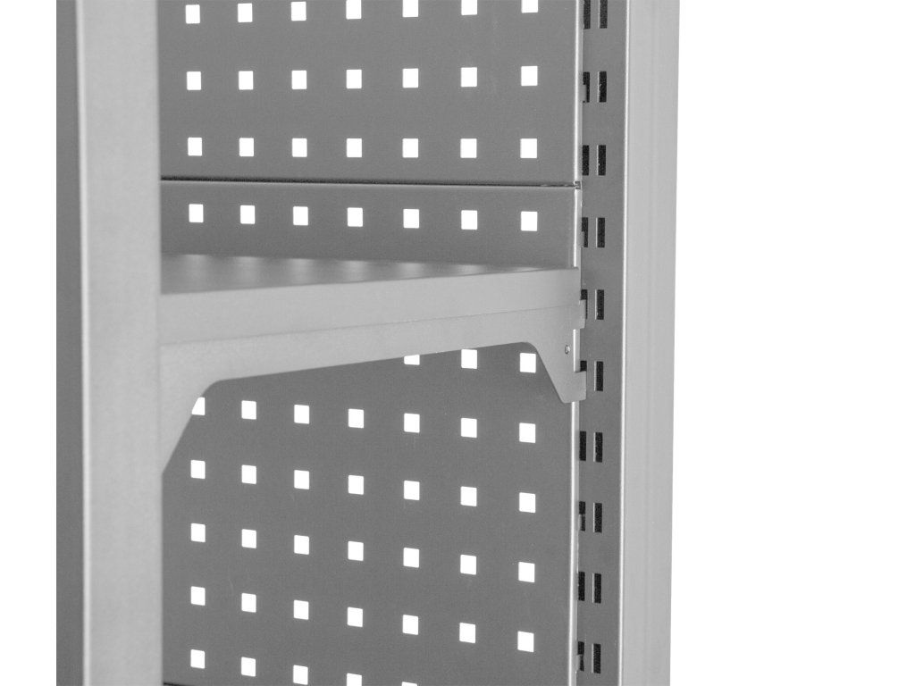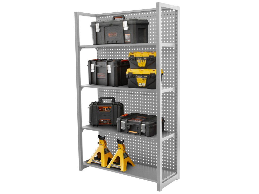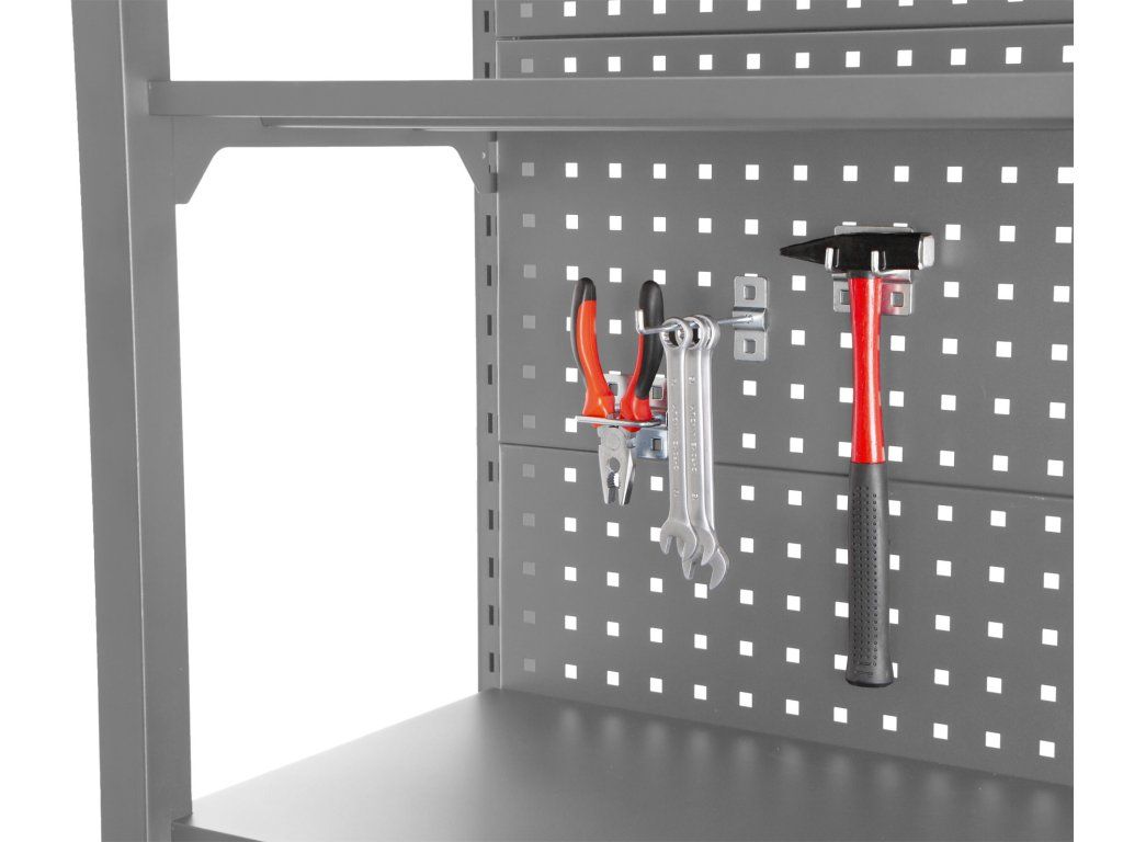 Stabilitu regálu zajišťují dvě bočnice a zadní děrovaná deska, která lze také využít pro zavěšení drobného nářadí pomocí háčků (háčky nejsou součástí balení).