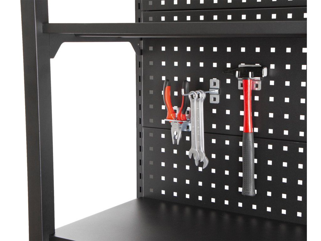 Stabilitu regálu zajišťují dvě bočnice a zadní děrovaná deska, která lze také využít pro zavěšení drobného nářadí pomocí háčků (háčky nejsou součástí balení).