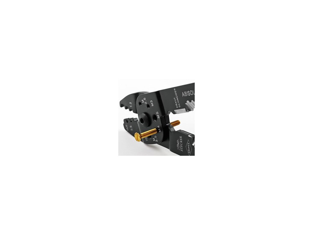 K stříhaní kabelů, odizolování drátů a lisování izolovaných a neizolovaných kabelových ok a konektorů a otevřených konektorů. S otvory se závitem k stříhání měděných nebo mosazných závitových kolíků s M 2,6- M 3- M 3,5- M 4 a M 5. šroubovaný kloub pro vysokou stabilitu a rovnoměrný chod. Speciální ocel, vysoce pevná.
