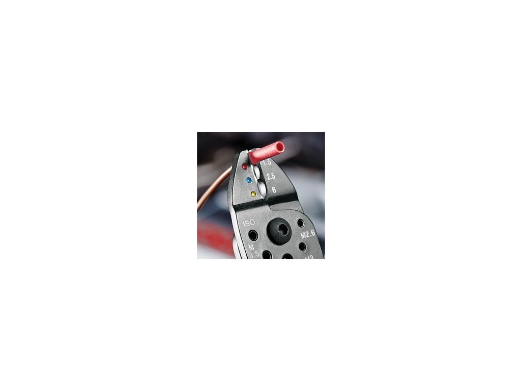 - K stříhaní kabelů, odizolování drátů a lisování izolovaných a neizolovaných kabelových ok a konektorů a otevřených konektorů