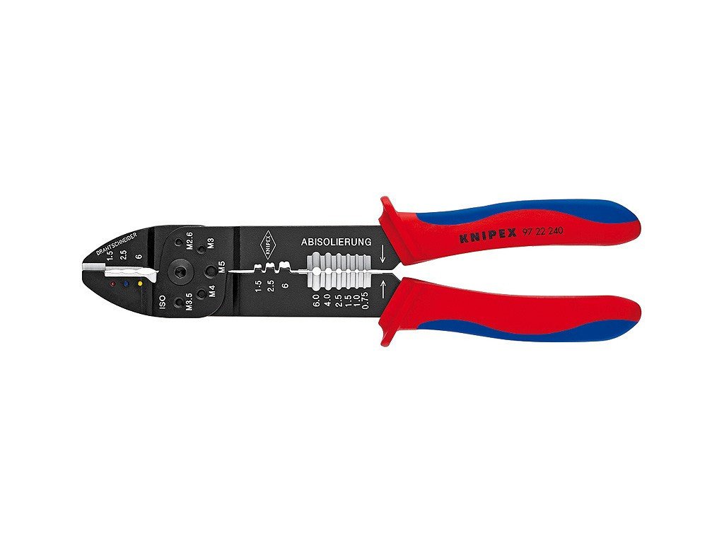 K stříhaní kabelů, odizolování drátů a lisování izolovaných a neizolovaných kabelových ok a konektorů a otevřených konektorů. S otvory se závitem k stříhání měděných nebo mosazných závitových kolíků s M 2,6- M 3- M 3,5- M 4 a M 5. šroubovaný kloub pro vysokou stabilitu a rovnoměrný chod. Speciální ocel, vysoce pevná.
