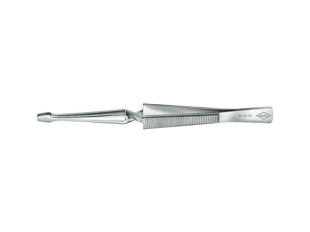 Pro uchopení menších součástek bez tlaku prstů. Dobře svírající. Poniklováno. Pružinová ocel, vysoce pevná. Rovný tvar. Plochy čelistí jemně ozubené. Drážkované rukojeti. Lichoběžníkový hrot.