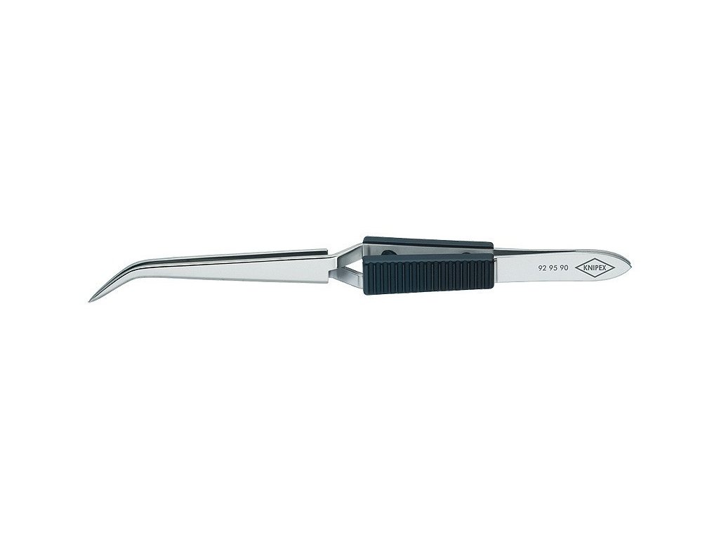 Pro uchopení menších součástek bez tlaku prstů. Dobře svírající. Poniklováno. Pružinová ocel, vysoce pevná. Plochy čelistí jemně ozubené. úzké hroty. Zahnuté hroty. S povlakem rukojetí.