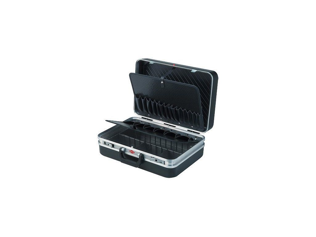 Odolné provedení z materiálu ABS, černé. Obvodový dvojitý hliníkový rám. Rastrové panty, které slouží jako držák víka. Stabilní, ergonomické držadlo na přenášení. 2 uzamykatelné sklápěcí zámky. 1 vyjímatelná deska na nářadí ve víku s 15 kapsami na straně dna a 6 velkými kapsami a jednou upnutou přihrádkou (širokou 400 mm) na straně víka, držena drukem. Dno ve tvaru vaničky, výška 58, rozdělitelné pružnými vložkami a s krycí deskou se 6 velkými kapsami na nářadí, fixovatelnou pomocí patentky. Krycí deska a deska na nářadí z materiálu Con-Pearl ®. Zatížitelnost do 20 kg. Bez nářadí.