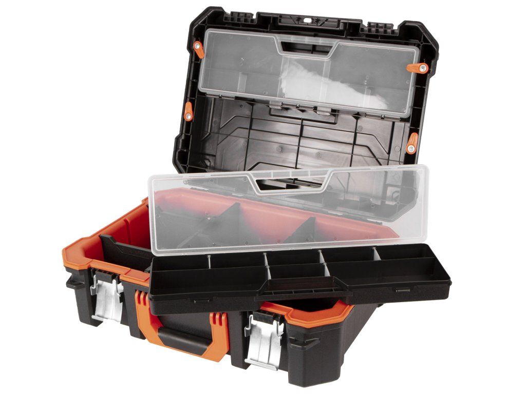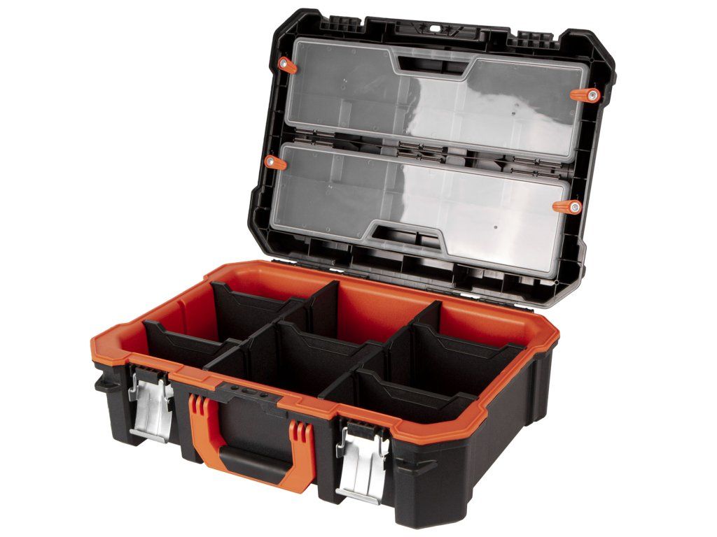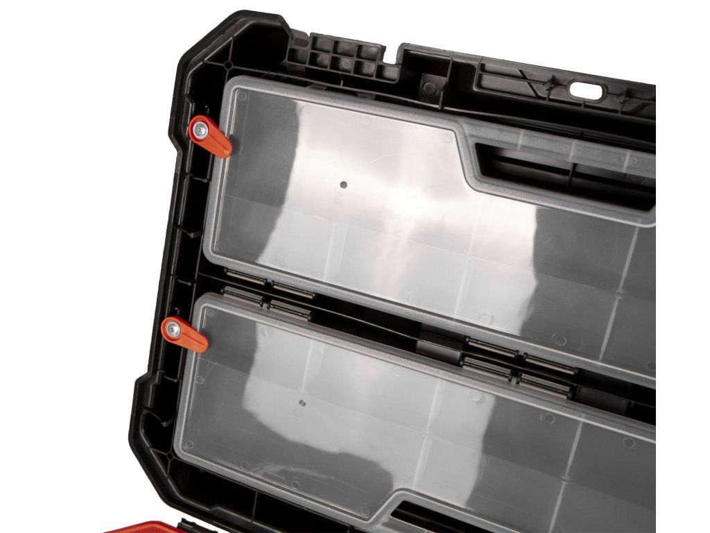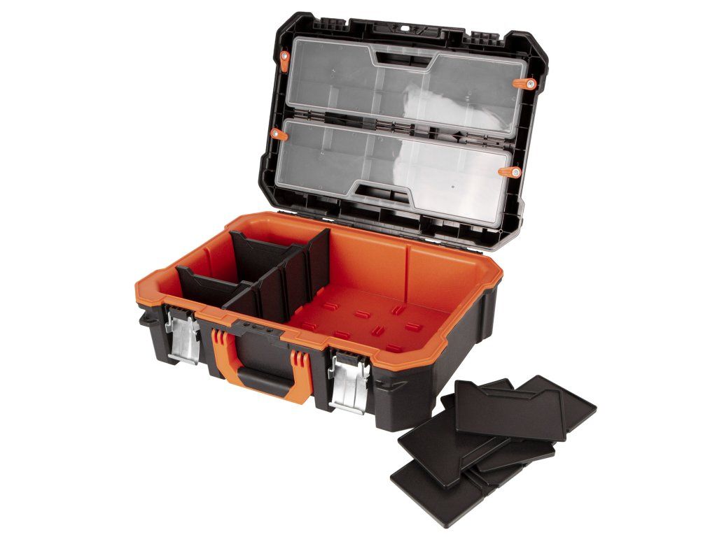 Díky vyjímatelným děličům si spodní velký prostor můžete přizpůsobit dle libosti a mít tak ve svém nářadí a drobném materiálu perfektní přehled.