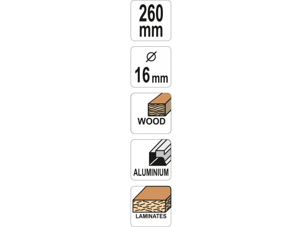 Úpravy materiálů: sádra, dřevo, neželezné kovy, kompozitní materiály a plasty. Čepel s rozměry 260x16mm.