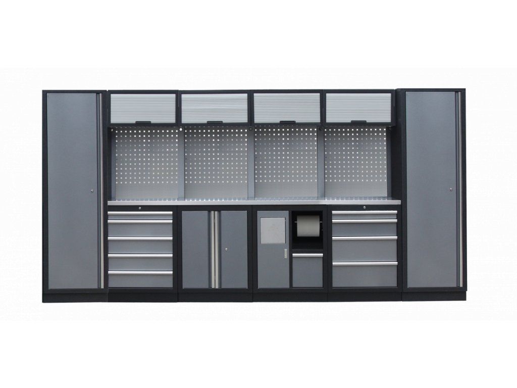 Sestava nábytku v sobě skrývá dostatečné množství úložného prostoru pro vaše nářadí, autotechniku i dílenské vybavení. V kombinaci s bytelnou pracovní deskou získáte multifunkční stěnu, se kterou vám půjde práce od ruky ve všech směrech.