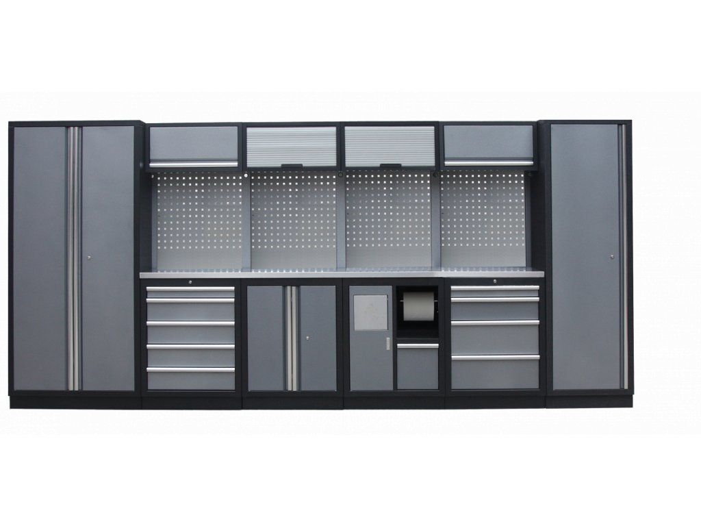 Sestava nábytku v sobě skrývá dostatečné množství úložného prostoru pro vaše nářadí, autotechniku i dílenské vybavení. V kombinaci s bytelnou pracovní deskou získáte multifunkční stěnu, se kterou vám půjde práce od ruky ve všech směrech.