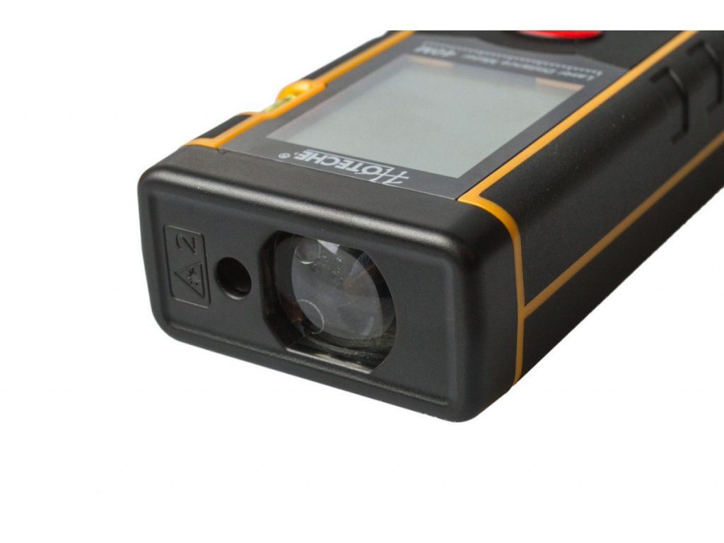 Laserový měřič vzdálenosti s pracovním dosahem 40 m značky Hoteche, který je vyroben z plastu a kovu.