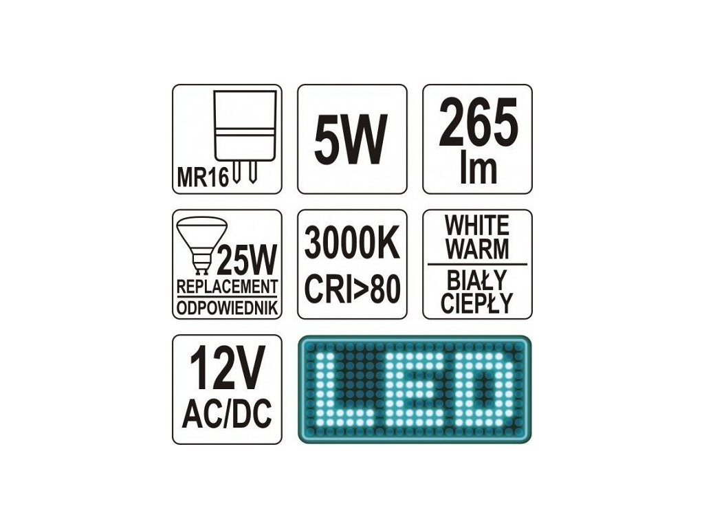 LED žárovka, náhrada za klasickou 25W žárovku, spotřeba 5W, světelný tok 265 lumen, patice MR16.