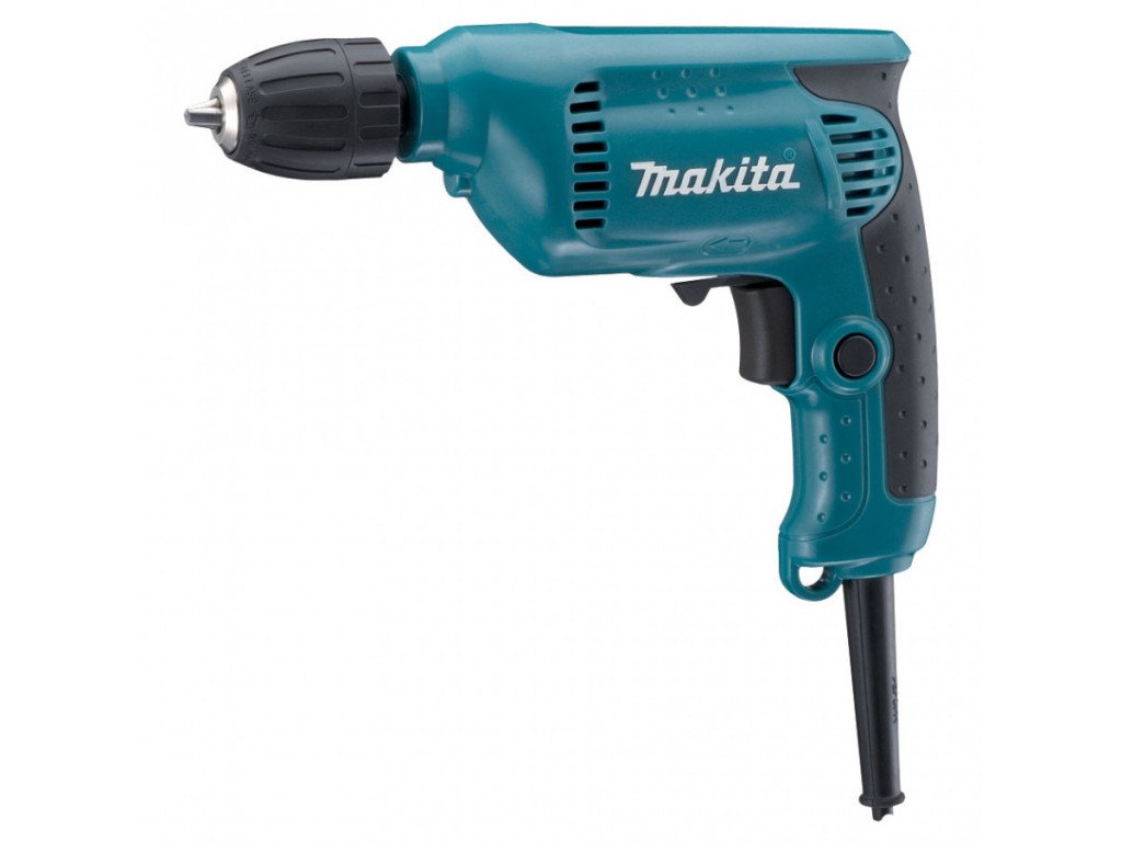 Lehká kompaktní elektrická vrtačka Makita 6413 se silným výkonem 450 W se hodí do každé domácnosti, nebo jako druhá pohotovostní vrtačka pro řemeslníky i HOBBíky. Díky nízké váze 1,3 kg a vyváženému tělu se dobře drží a umožňuje přesný přenos, v jedné přímce, vrtacího tlaku z rukojeti do vrtáku. Samotné tělo se skládá z robustního děleného pláště z plastu zesíleného skelným vláknem. U spouště naleznete páčku s přepínáním směru chodu Levý/Pravý a samotná spoušť je osazena elektronickou regulací otáček, které se díky tlačítku umístěného levém na boku rukojeti mohou zaaretovat.