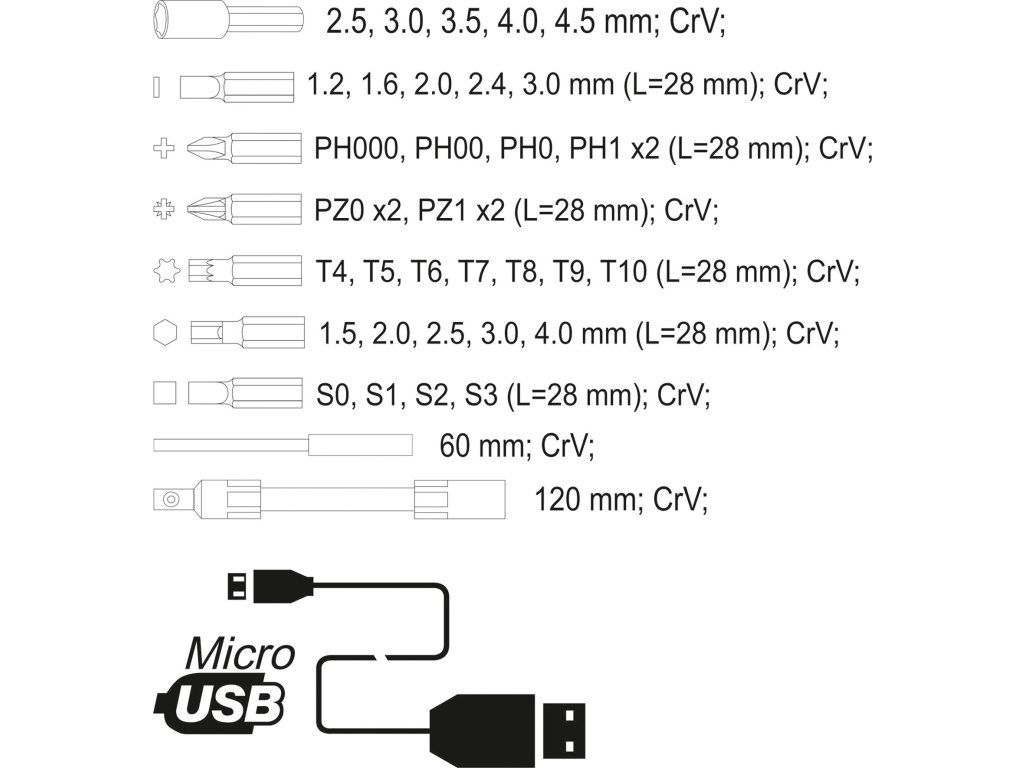 Baterie 3,6 V 450 mAh, LED osvětlení, magnetická patice, sada bitů.