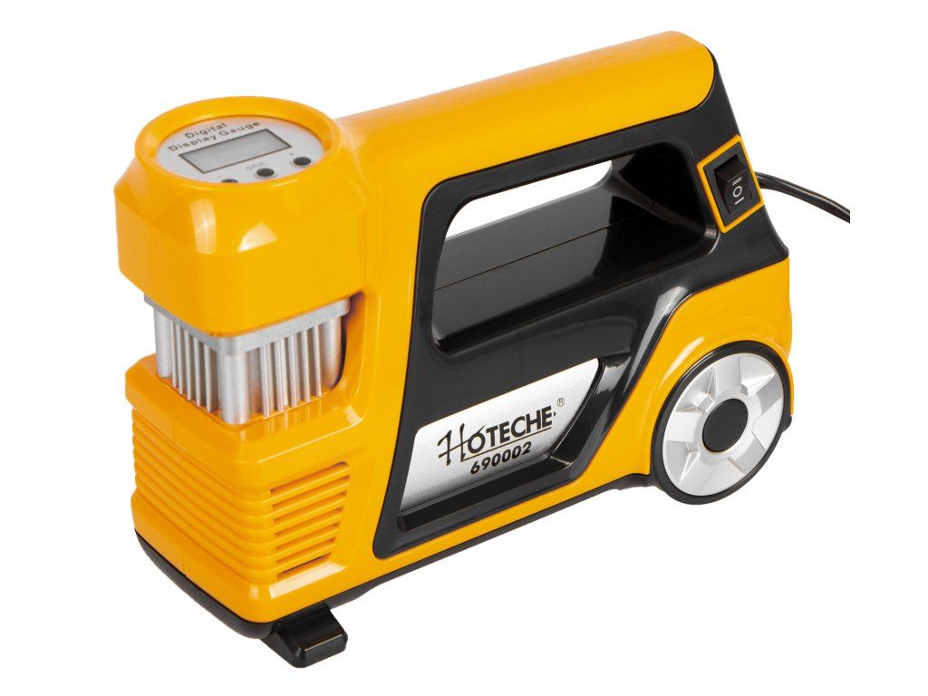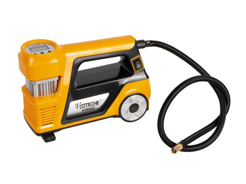 Přenosný vzduchový kompresor s napájením 12 V od značky Hoteche určený pro zástrčku zapalovače automobilu.